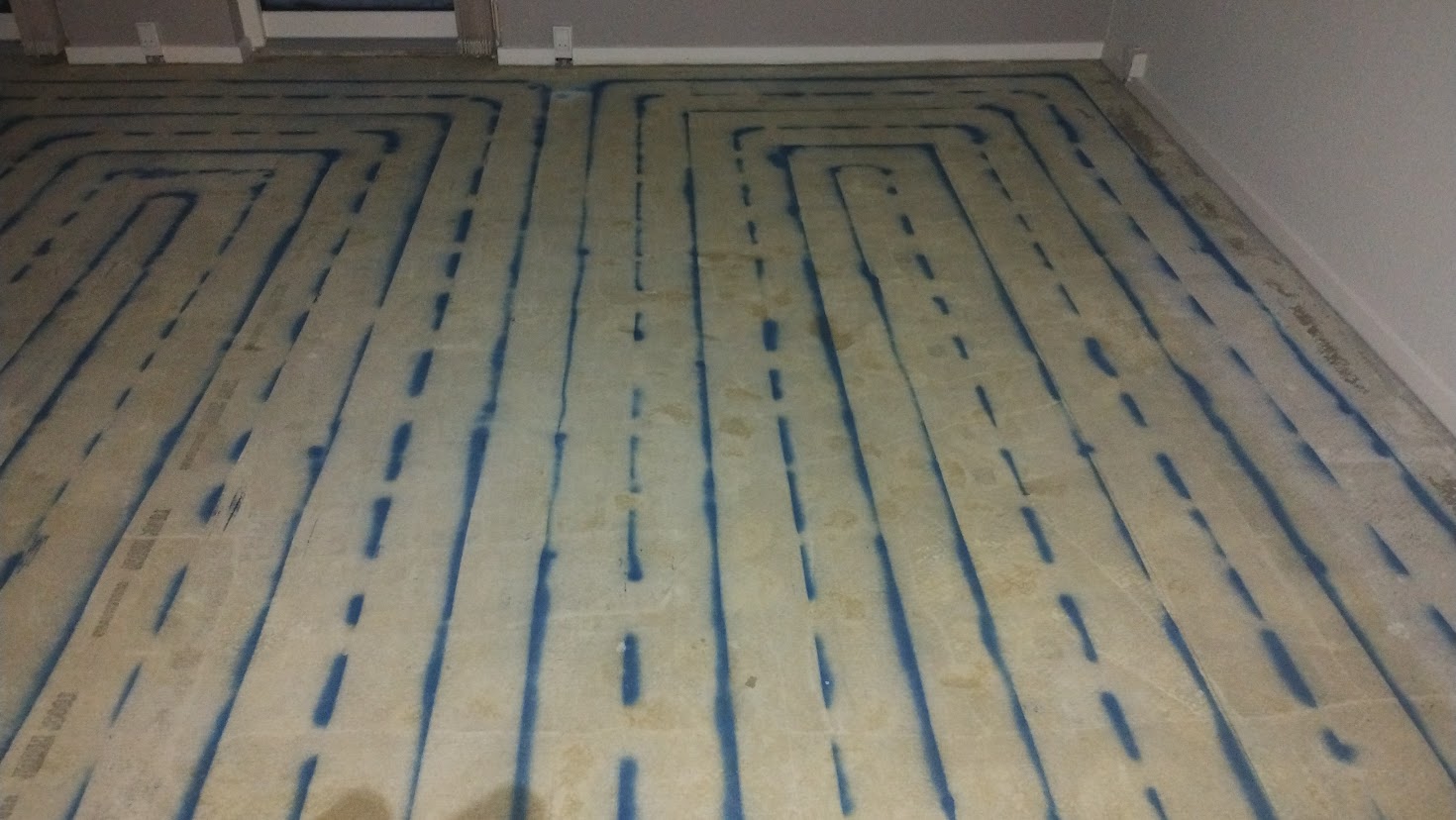 Her er huset rillefræst for gulvvarmeslanger. Efterfølgende er der udlagt flydemørtel ovenpå og nu klar til færdig gulv